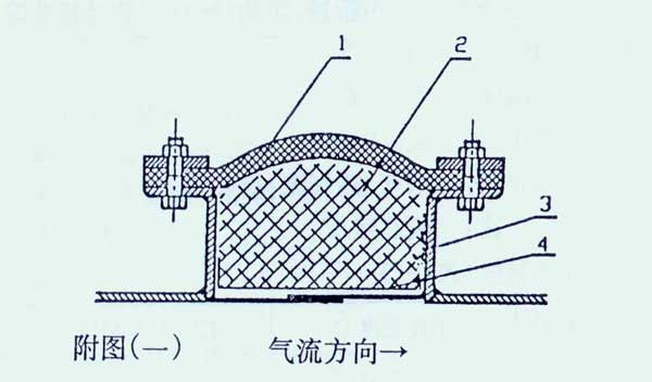 非金屬補償器是由:(1)非金屬復合圈帶 (2)隔熱填料層 (3)機架 (4)不銹鋼絲網(wǎng)等組成。見附圖。